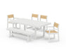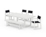 Set includes (2) EDGE Sling Dining Side Chairs, (2) EDGE Sling Dining Arm Chairs, (1) Farmhouse Trestle 65" Bench, and (1) EDGE 40" x 78" Dining Table